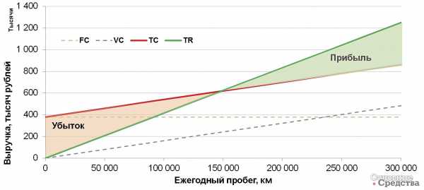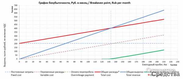 Решению об использовании аренды должен предшествовать точный экономический расчет. Принцип расчета показан на «Графике безубыточности». Из графика видно, что до определенной величины годового пробега транспортного средства расходы превышают выручку, а с момента наступления «Точки безубыточности» выручка превышает расходы и аренда становится выгодной (затраты по аренде ниже эквивалентных годовых затрат при владении). Пробег, который транспортное средство проезжает сверх точки безубыточности, приносит прямой доход.