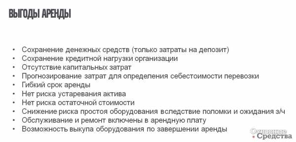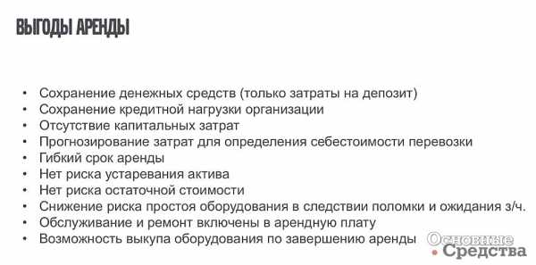 В случае использования аренды сохраняются денежные средства (имеются только затраты на депозит), кредитная нагрузка организации не увеличивается, отсутствуют капитальные затраты, затраты для определения себестоимости перевозки становятся прогнозируемыми, аренда имеет гибкие сроки, отсутствует риск устаревания актива и риск уменьшения остаточной стоимости, снижаются риски простоя техники вследствие поломки и ожидания запчастей, затраты на обслуживание и ремонт техники уже включены в арендную плату, возможен выкуп оборудования по завершении аренды.