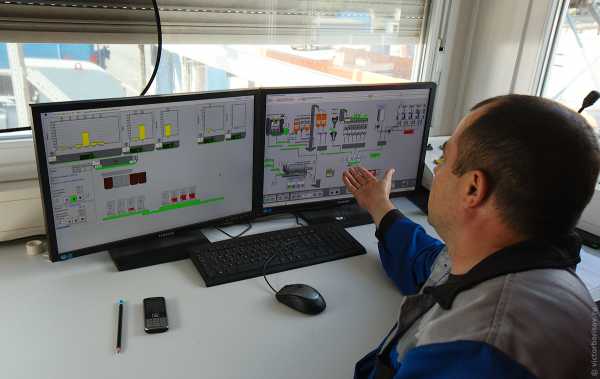 18. Диспетчерская — центр управления всей установки. Оператор наглядно видит весь процесс, а также вручную управляет заслонкой на отгрузке готовой продукции. На левом экране работа весов и бункеров. Справа — рабочий процесс в сушильной камере, грохоте и смесительной установке. Всего на заводе работает 80 человек, а для управления производственным процессом достаточно 10.