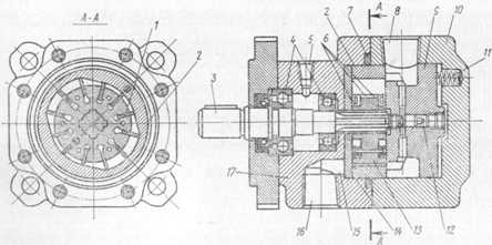 1 — пластина, 2— статор, 3 — вал, 4 — шарикоподшипники, 5 — дренажное отверстие, 6 — полости под пластинами, 7 — уплотнительное кольцо, 8 — сливное отверстие, 9. 14 — задний и передний диски, 10 — крышка, 11 — пружина, 12 — отверстие для подвода жидкости под высоким давлением, 13 — ротор, 15 — кольцевой канал, 16—подводящее отверстие, 17 — корпус