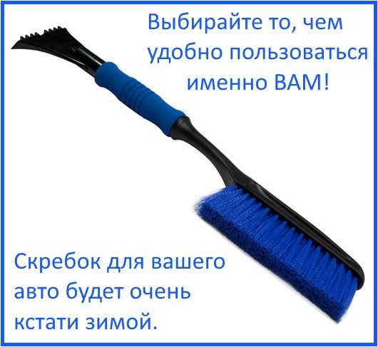 Ширину рабочей поверхности подбирайте, чтобы удобно было удалять наледь не только со стекол, но и зеркал. Ручка скребка должна удобно лежать в руке, достаточно длинной, чтобы вы могли достать до самых удаленных участков, и не доставлять дискомфорта при работе.
