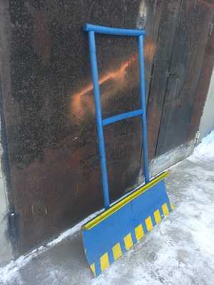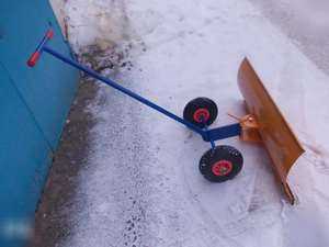 Для чистки дорожек удобно пользоваться отвалом. Внешне он похож на толкатель. Однако его ковш более высокий и, если он изготовлен из металла, его верх можно слегка завернуть по направлению движения. Поворот ковша под небольшим углом по отношению к ручке сделает такое приспособление более универсальным. Оно будет не только сгребать снег, но и отбрасывать его в сторону.