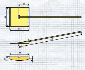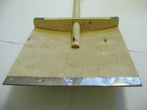 Деревянный скребок делается из трехслойной фанеры. Средний размер листа — 50 на 50 см. Все зависит от физических данных и предпочтения работающего. Режущий край листа для увеличения прочности обивают П-образной металлической лентой. Ширина произвольная, но следует учитывать, что если лента будет слишком широкой — это утяжелит конструкцию, а чрезмерно узкая — может оторваться. Подойдёт напуск в 3 см. Толщина ленты — 0,7−1 мм. Более тонкая быстро износится, а толстую тяжело сгибать.