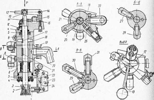 При перемещении золотника вниз по стрелке Р его канал соединяет кольцевую полость корпуса с одним из радиальных каналов на оси Б—Б. Гидрожидкость под давлением перейдет в соответствующую полость одного из цилиндров (группы цилиндров). Одновременно через канал и канал в корпусе гидрожидкость перейдет из противоположной полости цилиндра в бак.