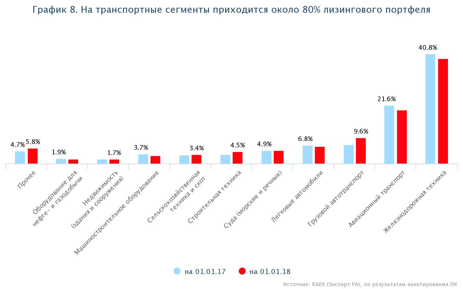 На транспортные сегменты в 2017 году пришлось около 80% лизингового портфеля: