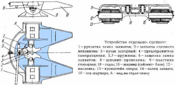 Седельно-сцепное устройство, установленное на автомобилях, служит для шарнирного соединения тягача с полуприцепом, передачи части нагрузки от полуприцепа на раму тягача и передачи тягового усилия от тягача к полуприцепу, обеспечивает полуавтоматические сцепку и расцепку тягача с полуприцепом.