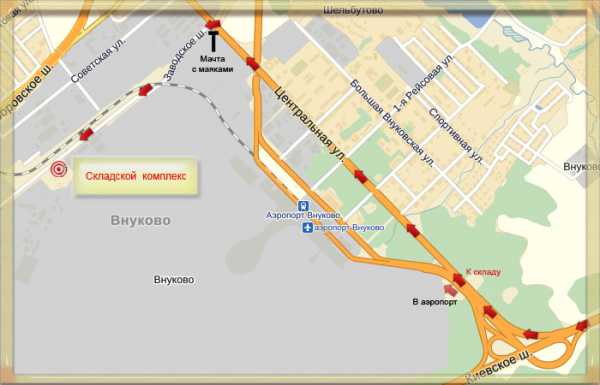 Проезд на автомобиле: Поворачиваете с Киевского шоссе направо под указатель «Внуково», держитесь правее. Проезжаете через весь городок, слева у Вас будет аэропорт (виден сквозь забор), доезжаете до перекрёстка Т-образной мачтой с маячками и видеокамерами и поворачиваете налево и продолжаете ехать опять вдоль аэропорта. Ровно через 1 км слева будут наши склады (синие раздвижные ворота).