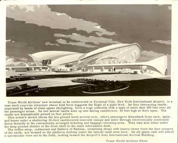 Саариненен приступил к работе над проектом нового терминала в 1955 году, когда аэропорт еще назывался Айдлуайлд. И тогда, да и сейчас, практика строительства отдельного терминала для одной авиакомпании была не очень распространена в мире. Но нью-йоркский международный аэропорт Айдлуайлд был одним из главных аэропортов страны, ее парадными воротами для путешественников со всего света, и центральным местом базирования для нескольких крупных американских авиакомпаний. Поэтому терминалы были больше, чем просто местом посадки и высадки пассажиров. Начиналась эпоха массового туризма, количество пассажиров постоянно росло и нужна была абсолютно новая концепция в отношении организации авиаперевозок. Просто небольшого здания аэровокзала было уже недостаточно. Саариненен начал решать еще только зарождавшиеся проблемы пассажирских перевозок и организации пассажиропотоков при помощи дизайна и архитектурных форм. Новая концепция потребовала больше времени и он попросил отсрочку на год для реализации проекта. Руководство TWA было настолько увлечено его идеями, что без проблем согласилось на такую задержку. В 1957 году был представлен первый проект. Для авиакомпании новое здание стало самым настоящим символом и отражением их новой философии.