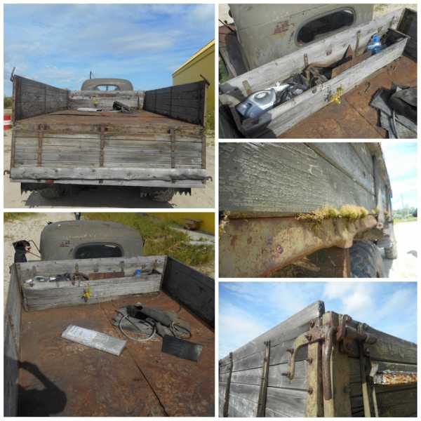 Кузов. Поскольку это грузовой автомобиль, то сзади у него должна быть какая-то надстройка. В данном случае это обычный бортовой кузов. Самое интересное, что он еще родной, с оригинальными железными петлями и запорами. В отличие от своего собрата ГАЗ 63, у 157-го борта откидываются с трех сторон, обеспечивая лучшую погрузку/выгрузку. Что сюда загрузить? Учитывая народно-хозяйственную версию – что угодно, от урожая до ящиков с вещами или запчастями. Военная версия отличалась более низкими бортами, и были они решетчатыми (складные лавки), с присутствием дуг для тента.