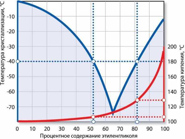 Этиленгликоль — двухатомный спирт, в чистом виде имеющий температуру замерзания около -13°С и температуру кипения 197°С. Удивительное свойство водного раствора этиленгликоля заключается в более низкой температуре замерзания, чем каждого вещества в чистом виде. Так, смесь в пропорции 1 к 1 будет иметь температуру замерзания -38°С.