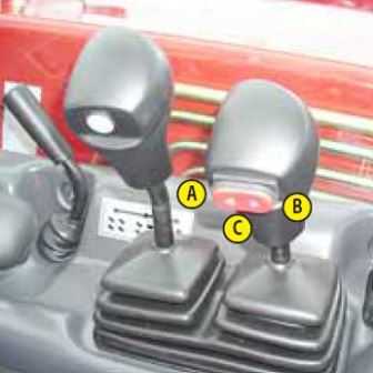 | ПЕРЕДНИЙ ХОД: передвинуть переключатель вперед (положение А). ЗАДНИЙ ХОД: передвинуть переключатель назад (положение В). НЕЙТРАЛЬНОЕ ПОЛОЖЕНИЕ: чтобы запустить погрузчик Маниту, переключатель должен находиться в нейтральном положении (положение С). ПРИМЕЧАНИЕ: Фонари и звуковой сигнал оповещают о движении телескопического погрузчика задним ходом. |